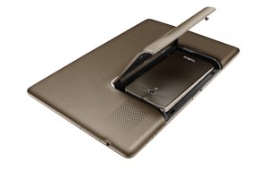 Faisons simple, cette tablette 10 pouces est en fait une boîte presque vide… un écran, des connectiques, mais rien de plus. Là où je fonds, c’est avec le smartphone qui l’accompagne (écran 4.3 pouces), il se recharge à la tablette et lui offre sa connectivité 3G en même temps et surtout son processeur double cœur et Android 4.0. Pour m’achever, il se transforme aussi en Notebook avec un dock clavier/batterie comme le Transformer du même constructeur. Un couple fait pour fonctionner en parfaite harmonie à voir comment ensuite la chose évoluera à l’usage. Le Tawainais sait ne faire du bon matos aucune mauvaise surprise. Le design est tout aussi soigné, un parfait équilibre entre les lignes et la praticité.