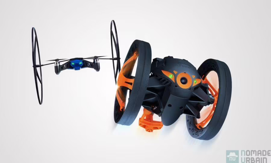 Le Jumping Sumo est un drone roulant au look arrondi et qui avec quelques stickers bien placés peut devenir bien plus agressif. Véloce il est très rapide et se permet même quelques cabrioles et surtout il saute jusqu’à 90 cm !