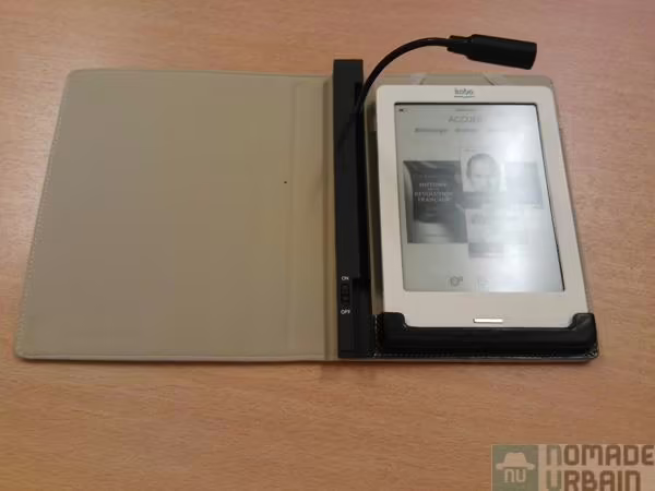 Pour commencer, le Kobo est plus séduisant que le Kindle. Son dos affiche un relief type coussinet, le tout légèrement laqué. Cela donne un aspect visuel agréable et il faut l’avouer que je trouve un peu féminin. Cela ne me gêne pas, mais en rebutera certains.La prise en mains est agréable et il est léger. Le tenir d’une main pendant plus d’une heure ne sera pas une torture.