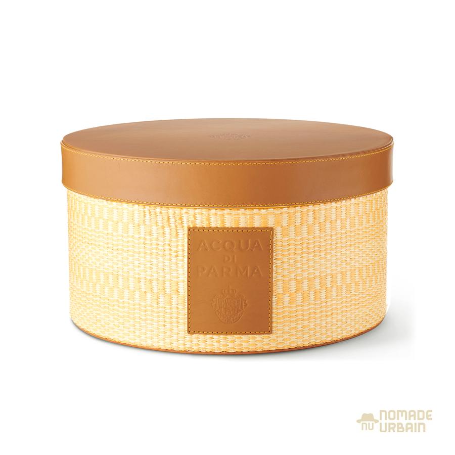- Une boîte à chapeaux en cuir et raphia, clin d’œil au glamour des voyages d’antan.