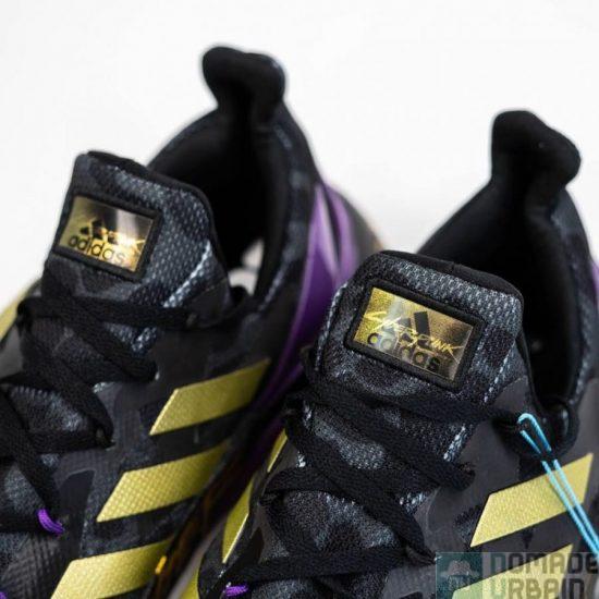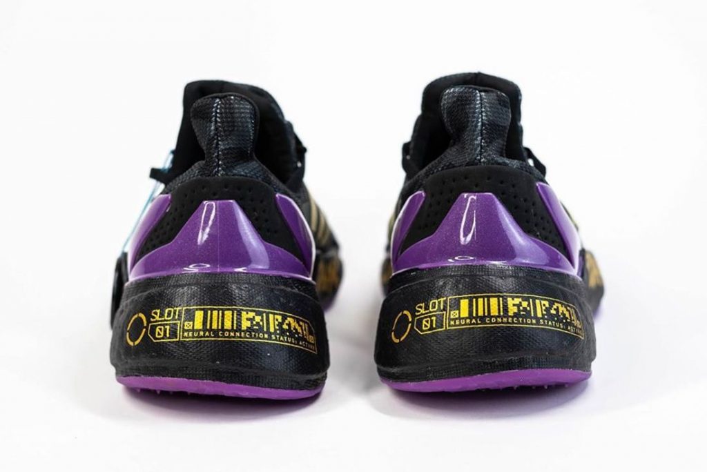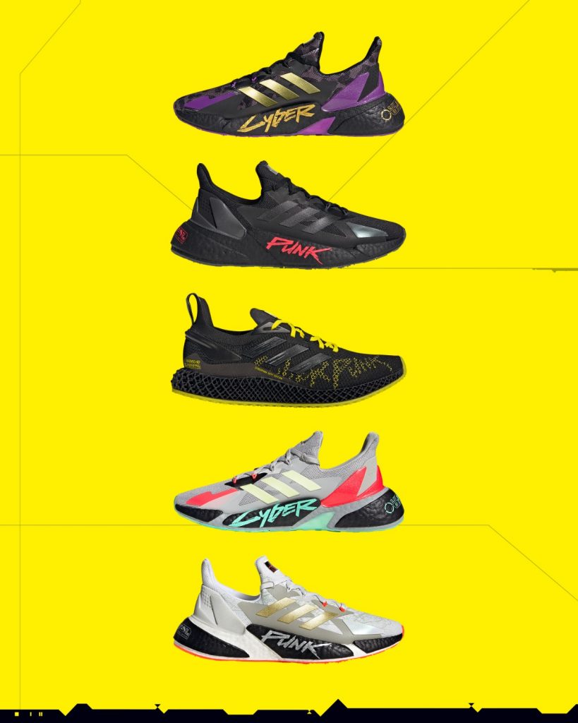Adidas applique des inserts de couleurs, et en bien gros le titre du jeu qui reprend la police de la jaquette du jeu. Ajoutez quelques petits clins d’œil. Comme sur la X90004D qui affiche une tige entièrement noire, avec des touches de jaune sous la forme d’un coup de logo « CYBERPUNK », de lacets et d’un contre-lettrage au talon.