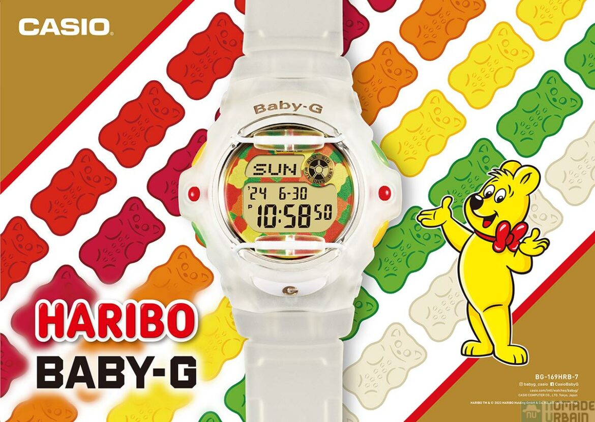 Pour une première collaboration, nous sommes gâtés, car les bonbons en gélatine en forme d’ours aussi célèbres, que gourmands sont les stars de cette montre. Le japonais reprend son iconique BG-169 de la gamme Baby-G et de son design rétro. Qui est ici sublimé par une palette aux couleurs acidulées, avec en fond la délicieuse silhouette de ces sucreries.