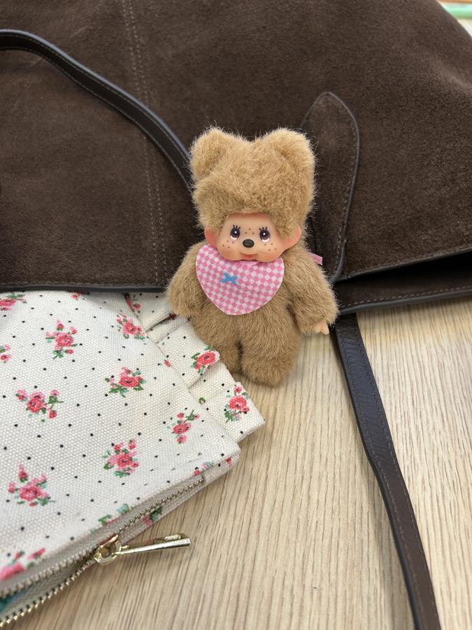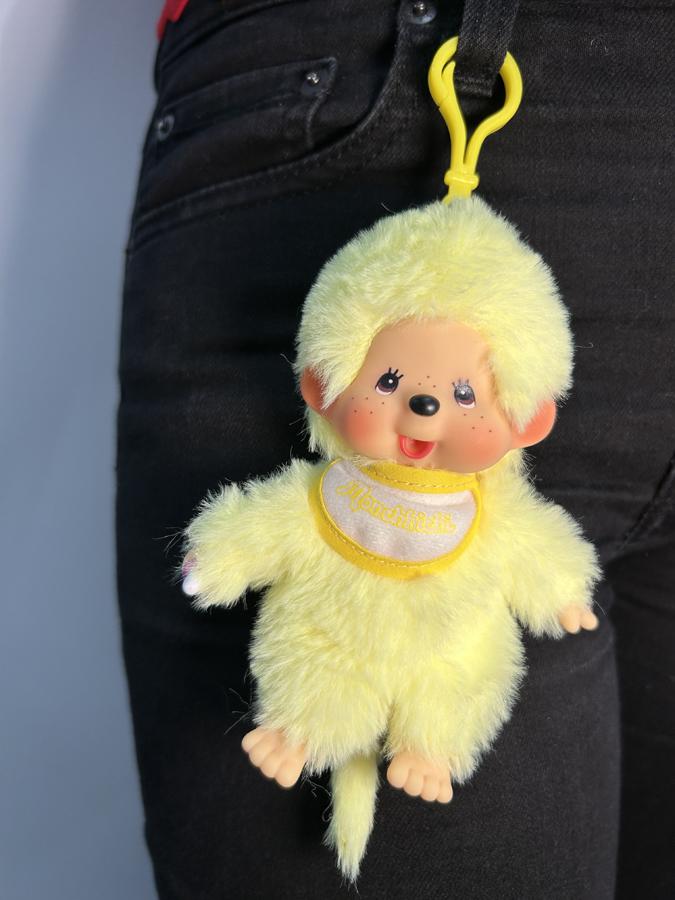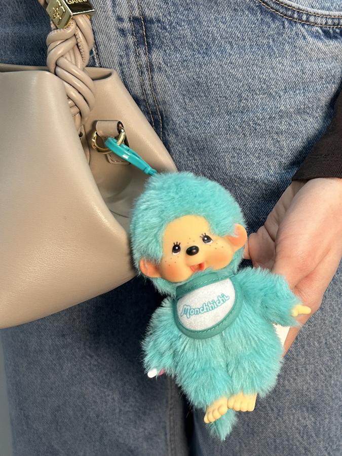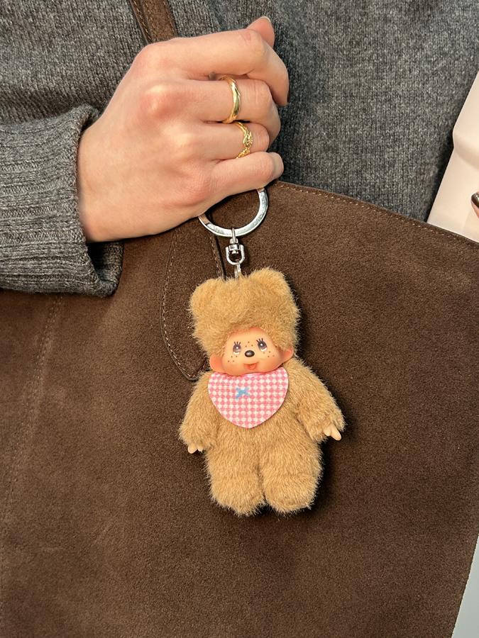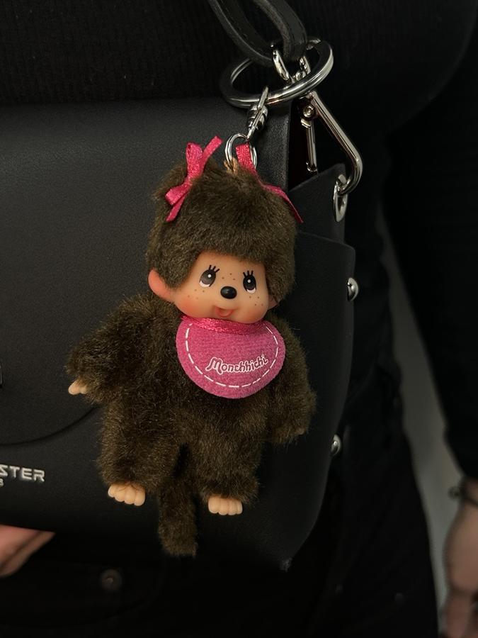 Ce qui fait la force de Monchhichi dans ce contexte, c’est son visage. Le petit singe rond aux grands yeux, fourrure brune et bavoir coloré : tout le monde le reconnaît en une seconde, qu’on ait grandi avec ou non. Or c’est exactement ce que recherche cette tendance : un objet qui se remarque, qui crée une réaction et qui dit quelque chose sur celui qui le porte.