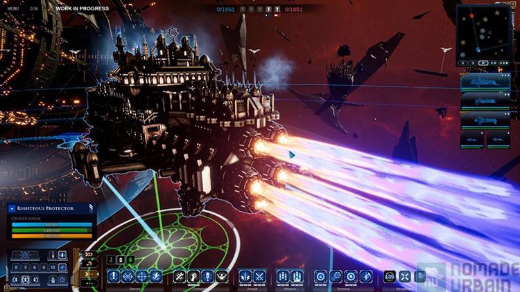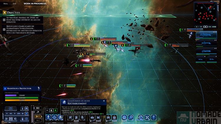 Chaque camps a ses qualité et défauts. L’Empire est fortement blindé et armé, le Chaos est plus véloce et tout autant destructeur. Nous sommes ici en temps réel, l’interface est assez claire avec la carte en 3D qui occupe l’écran et en bas une barre d’action. Tirer des missiles, envoyer des chasseurs ou éperonner l’ennemis, j’ai l’embarras du choix et cela me plait. Je dois juste surveiller mes points d’actions et les utiliser avec soin.Une carte stratégique affiche l’ensemble des systèmes et des menaces pour déplacer vos flottes. Chaque mission peut être gagné en éliminant ses ennemis, mais également en capturant certains points tactiques. Il y’a une réelle diversité dans chaque aspect de ce titre.