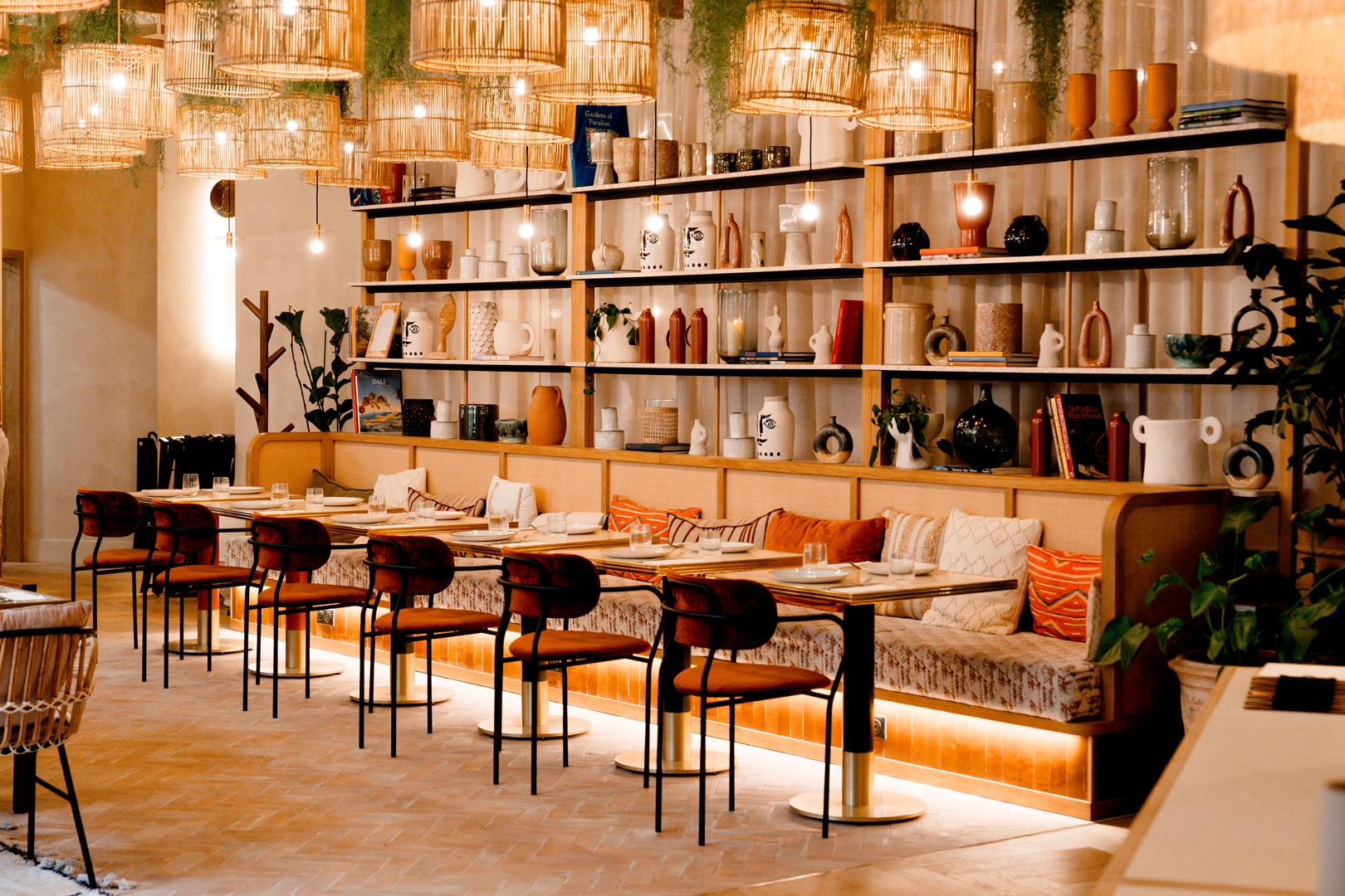 Des accessoires, comme les vases d’Anduze, installent une évocation d’été. Les couleurs chaudes éclairent l’ensemble et soutiennent l’idée de dépaysement. Au rez-de-chaussée, la hauteur sous plafond et l’agencement généreux créent un espace accueillant, propice aux pauses longues. Le comptoir se transforme en bar XXL. Le restaurant s’inscrit dans la continuité. L’adresse vise un rôle de lieu de vie, où voyageurs et habitués se croisent naturellement. Bloom House Paris s’inscrit ainsi comme une parenthèse verte au cœur du 10e arrondissement.