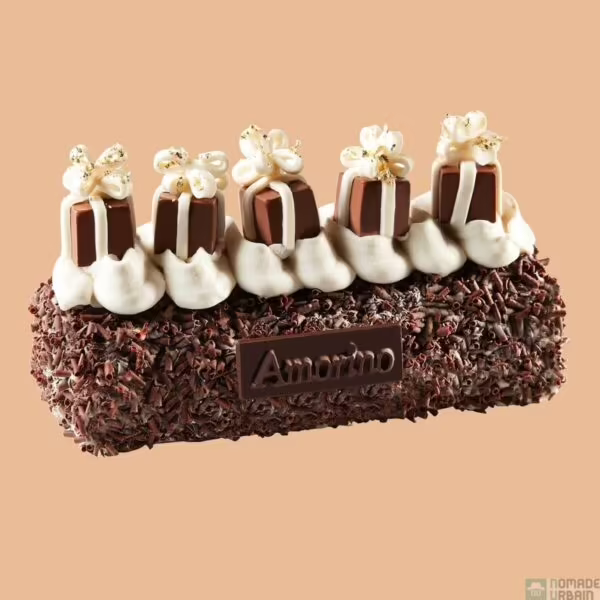 Trônent au dessus, des paquets cadeaux à la glace chocolat Amorino, rubans de chocolat blanc et feuilles d’or.
