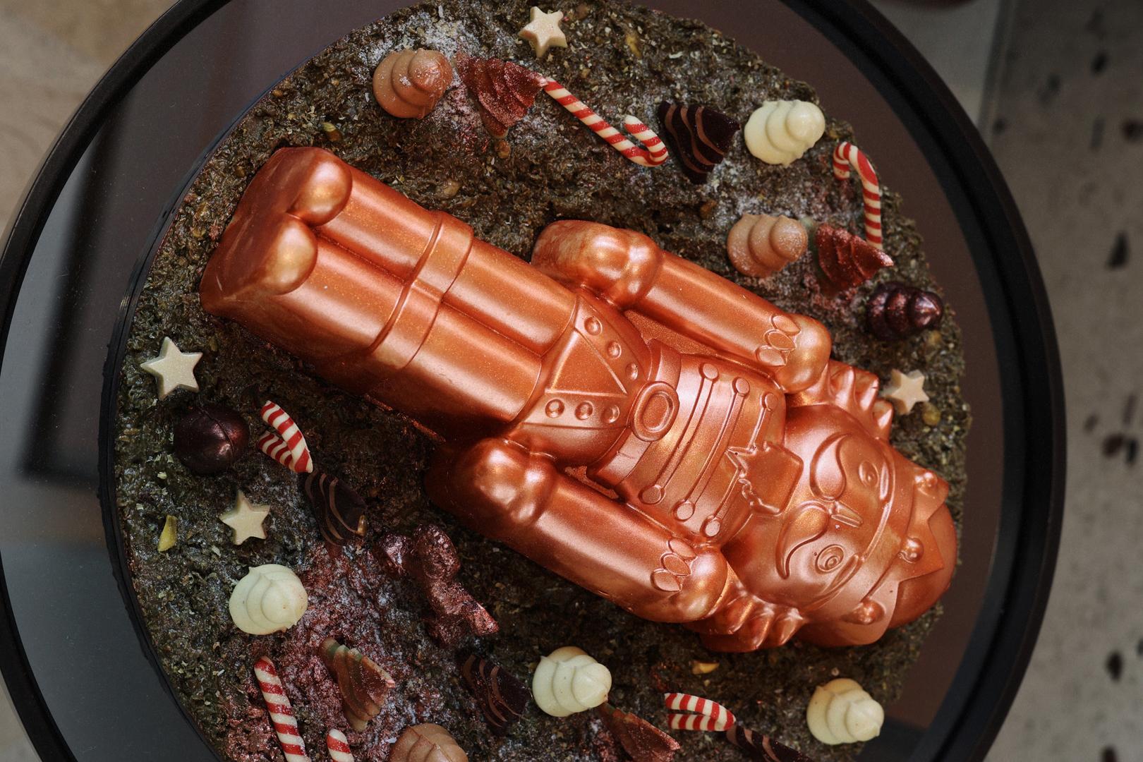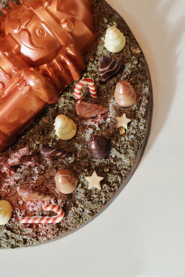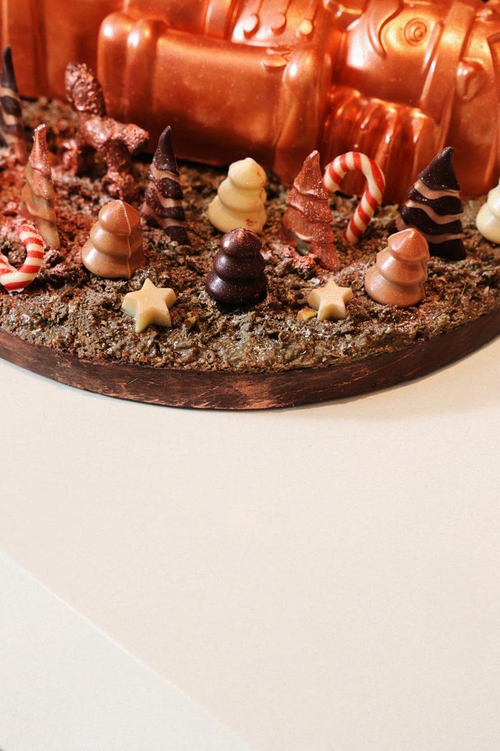 L’expérience se prolonge avec le support qui se transforme en gourmandise à part entière. Le plateau forme un mendiant géant aux trois chocolats parsemé de noisettes et de pistaches . Il intègre un croustillant exclusif inspiré du « Chocolat Dubaï » à base de pâte de pistache et de kadaïf . Des sapins en chocolat et des sucres d’orge entourent la pièce pour créer un paysage comestible . Cette bûche pour huit