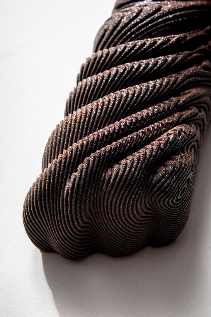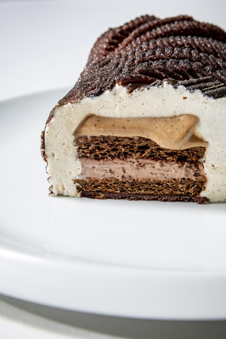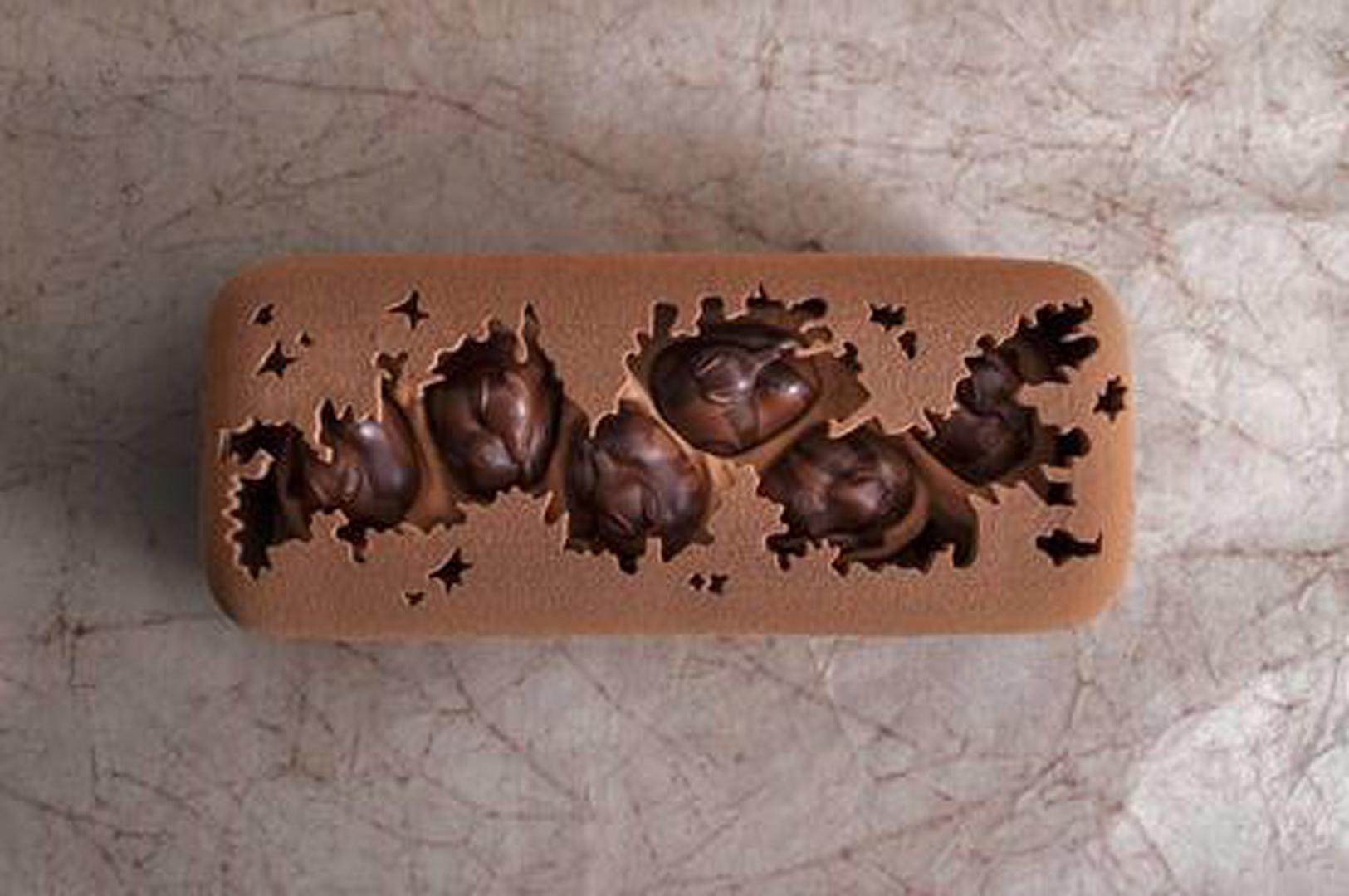 Une mousse aérienne constitue le corps principal du dessert. Elle utilise un cacao rare originaire de Papouasie. Cet ingrédient apporte une force aromatique singulière. Le cœur de la bûche dissimule des inserts de praliné noisette. Ils renforcent la gourmandise et le fondant de l’ensemble. L’esthétique du gâteau est particulièrement soignée. Un effet velours brun habille toute la surface. Des motifs en arabesques sculptés décorent le dessus avec élégance.