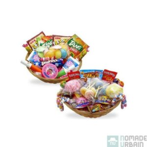 Le site Génération Souvenirs propose des packs de bonbons rétro années 80. Difficile de ne pas craquer sur le lot de 2 paniers avec un premier qui comprend : 1 Chewing-gum Mammouth Jawbreaker (boule de 5 cm de diamètre), 4 Colliers de bonbons look o look, 2 Frizzy pazzy (goût fraise), 5 Têtes brûlées (goût cola), 4 Sucettes Chupa Chups (goûts aléatoires), 4 Sachets de graines de tournesol « Pipas », 4 Coquillages « Roudoudous » à lécher, 2 Boules de coco, 1 Sachet de 5 sucettes lollies. Le second est encore plus craquant, avec deux sachets de vrai Tang ! En complément vous trouverez aussi : 4 Carambars caramel, 2 Sucettes Fresquito (goût cola à la poudre), 10 Soucoupes à la poudre, 2 Chewing-gums Tubble Gum (goût tutti frutti), 2 Chewing-gums Roll’up (goût tutti frutti), 2 Sifflets Look o look, 1 Boîte de Smarties, 5 Fizzy Rolls. En bonus, les paniers sont en osier, pour les conserver et y mettre encore plus de bonbons !
