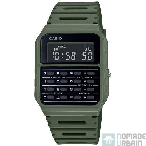 Avec des dimensions de 43,2 mm x 34,4 mm x 8,2 mm pour environ 25 g, la CA-53W est une montre aux dimensions généreuses, mais rien d’excessif que ce soit un poignet féminin ou masculin. Pour cet été et la rentrée, le constructeur japonais réédite sa montre star dans sa collection vintage. Elle est donc parfaitement identique, boîtier en métal inoxydable inclus. L’écran LCD monochrome minimaliste trône au-dessus d’un clavier numérique de 0 à 9 et les opérations (division, multiplication, soustraction et addition) sur la dernière colonne de touches. Un look unique qui a rendu bien des services à des collégiens, commerciaux et technoaddicts de l’époque. La réédition se décline en cinq couleurs, vert, bleu, noir, bordeaux et blanc. Chacun accompagné d’un bracelet qui n’est plus en caoutchouc comme dans les années 80, mais en résine.