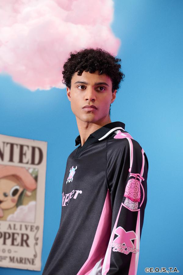 Le maillot à manches longues, également à 39,99 €, joue noir et rose. L’emblème de notre personnage est à l’avant, le nom au dos. Le numéro 06, lui, n’est pas décoratif : il rappelle que Chopper est le sixième membre à avoir rejoint l’équipage. Des pétales de cerisier viennent compléter la composition.