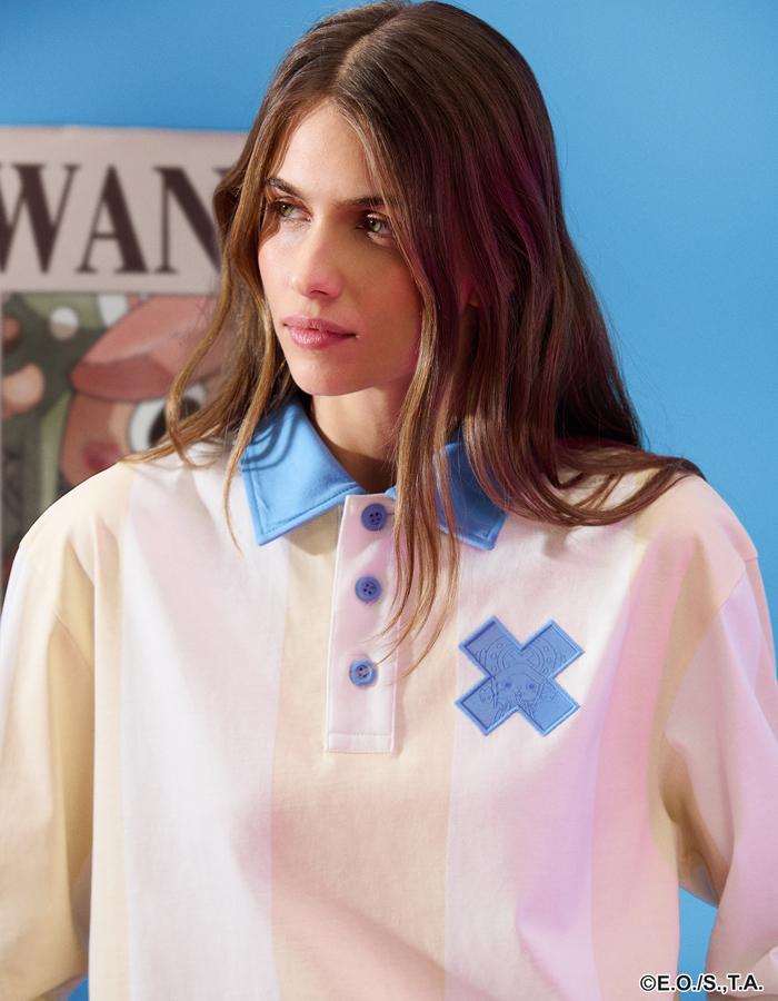 Le polo à manches longues à 29,99 €, quant à lui, joue blanc et jaune avec des bandes verticales. La croix de Chopper est brodée en bleu côté cœur, avec un portrait du personnage. Son emblème complète la manche gauche.