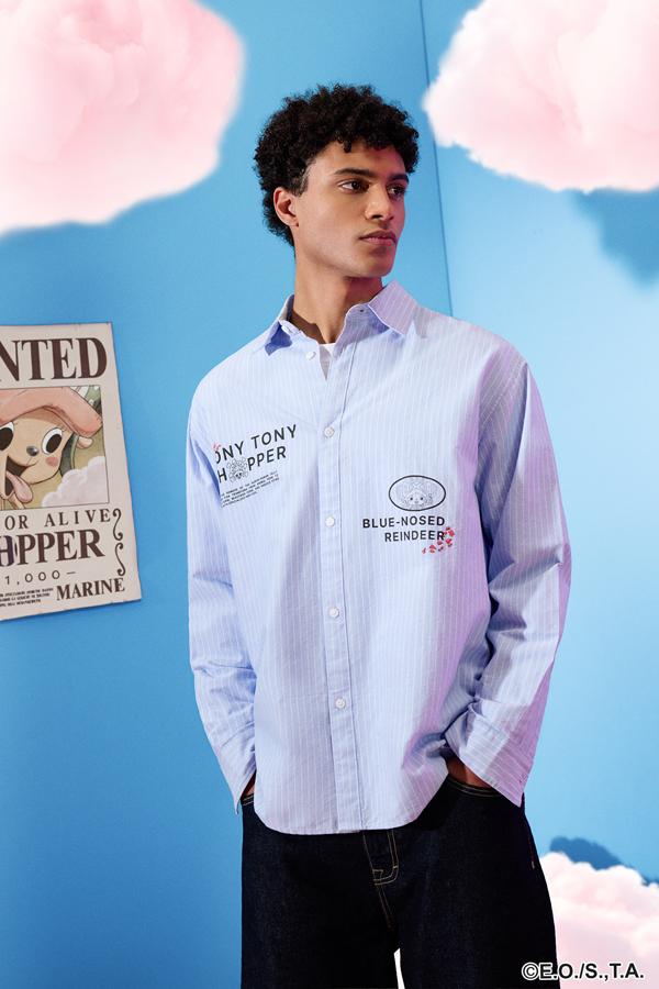 La chemise oversize à 39,99 € adopte un traitement plus discret. Rayée, elle intègre les références au personnage de façon fragmentée : portrait, nom, description et la mention « Blue-Nosed Reindeer », son surnom anglais, accompagnée de pétales de cerisier. Pour ceux qui préfèrent porter la référence sans l’afficher.