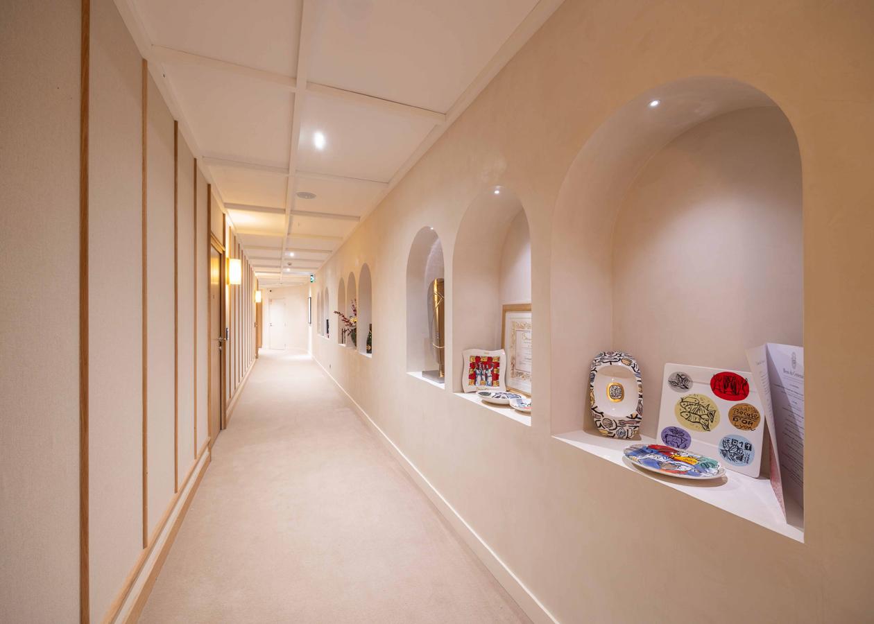 Derrière une façade des années 1920 restaurée à l’identique, le bâtiment s’ouvre sur un jardin intérieur végétalisé à ciel ouvert. La lumière naturelle y entre librement, du rez-de-chaussée jusqu’aux étages. Elle pose ainsi le ton : blanc, bois clair, volumes dépouillés. Des touches terracotta réchauffent les chambres, tandis que des arches en pierre structurent les espaces communs.