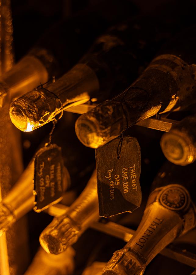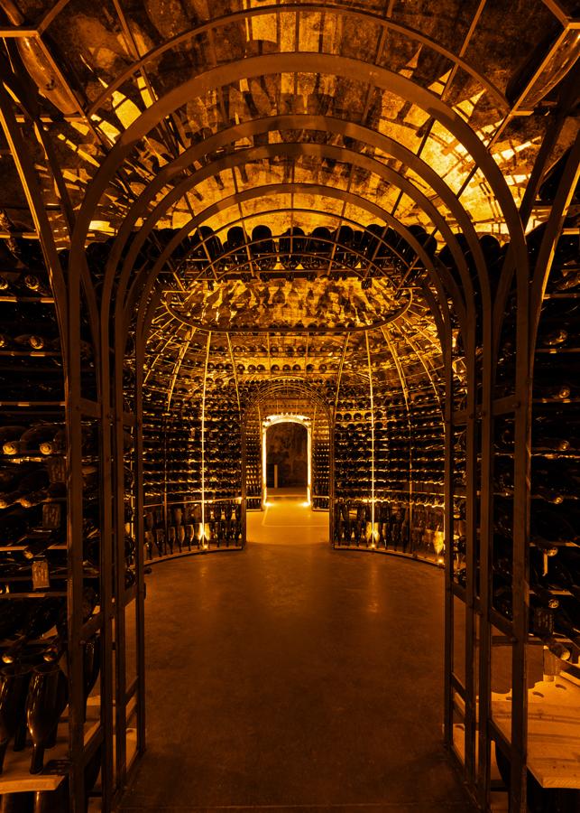 Le circuit des caves se réserve indépendamment de l’hébergement. Il descend sous le bâtiment dans des galeries datant du XIIIe au XVIIe siècle. Le parcours traverse d’abord l’espace où les équipes assemblent et vinifient encore les vins de base. Il longe ensuite la vinothèque de la Maison.