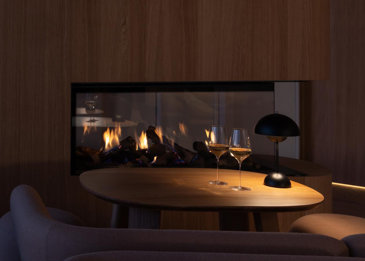 À l’opposé, trois étages plus haut, l’ambiance change radicalement. Le bar à champagne abandonne le blanc et le bois clair des chambres pour des tons sombres et chauds. Une cheminée à flamme vive et un éclairage ambré y renforcent cette chaleur. La terrasse extérieure de 500 m² s’ouvre quant à elle sur une vue directe sur la Cathédrale Notre-Dame.