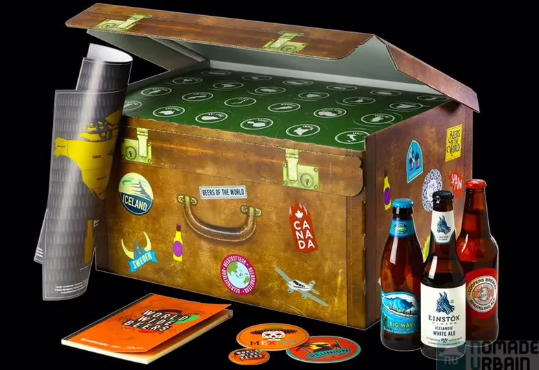 En plus des bouteilles, la valise contient une mappemonde à gratter au gré de vos découvertes et un livret sur les pays et les bières explorés.