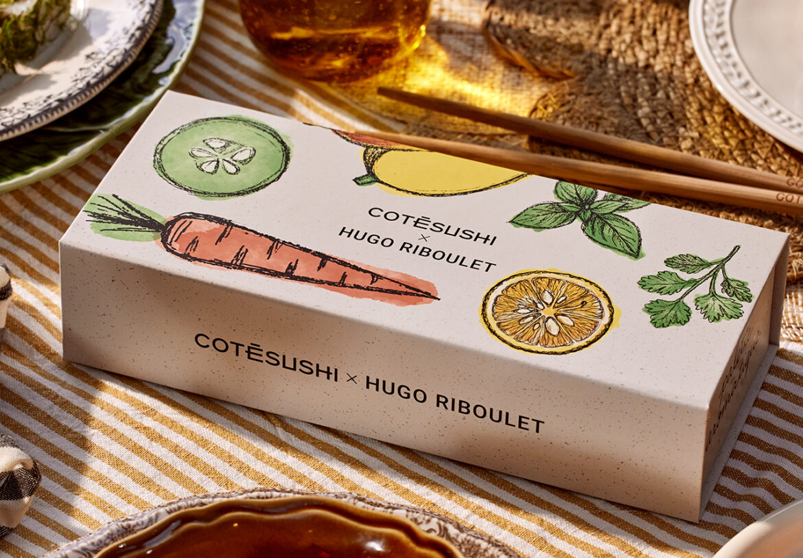 Chez Côté Sushi, cette collaboration avec Hugo Riboulet part d’une idée simple, faire passer les légumes, les herbes et les pickles au premier plan. Le chef, lauréat de Top Chef 2023, signe une collection courte et lisible. Qui est pensée pour le printemps et vendue en édition limitée.