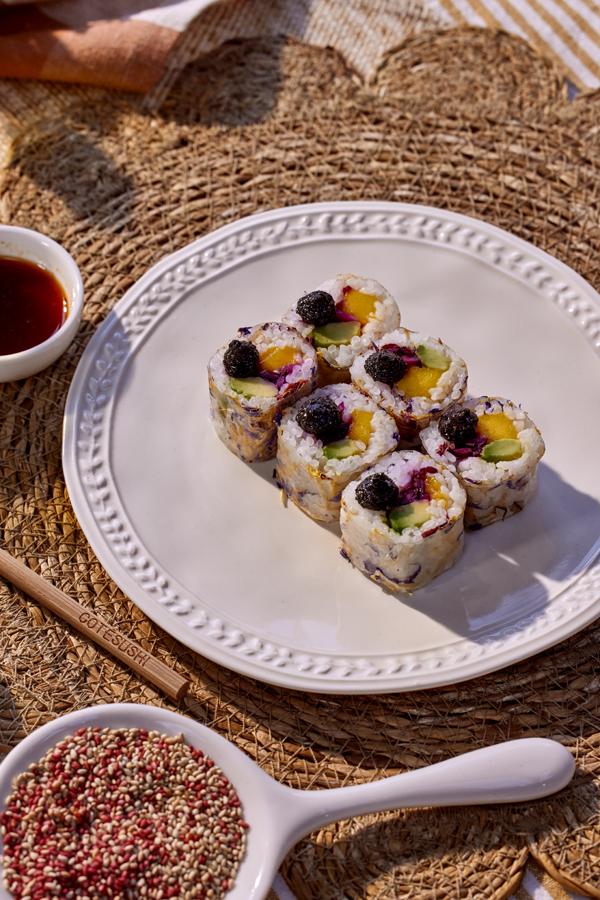 Le Samba Mangue Sésame Noir change de registre. Mangue, chou rouge, avocat, menthe et coriandre sont enveloppés dans une galette de riz aux fleurs séchées. Une crème de sésame noir toasté au feu de bois et broyé à la meule de pierre apporte la profondeur. Le mélange umeboshi et sésame blanc ajoute ensuite une texture supplémentaire.