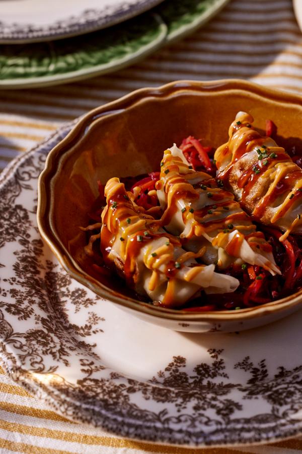 Les Gyozas de printemps ferment la marche avec une lecture plus nerveuse. Ils sont garnis de légumes et de nouilles de patate douce. Des pickles de carottes multicolores et d’oignons rouges, une sauce aji panca, une spicy mayo et de la ciboulette leur donnent un profil plus relevé.