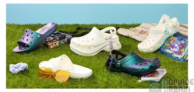 Pour un apéro, une longue balade avant un pique-nique sur les quais, à tout moment vous pouvez marcher avec confort tout en ayant un look saisissant. La robe en blanc et en noir et blanc/rose irisé accroche l’œil non ? Comme toute la famille, vous pouvez les personnaliser avec des Jibbitzt, dont des exclusifs aux Crocs Disco.At.Home.
