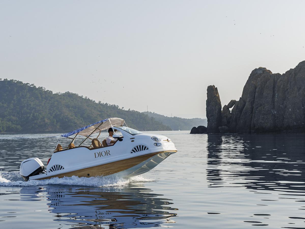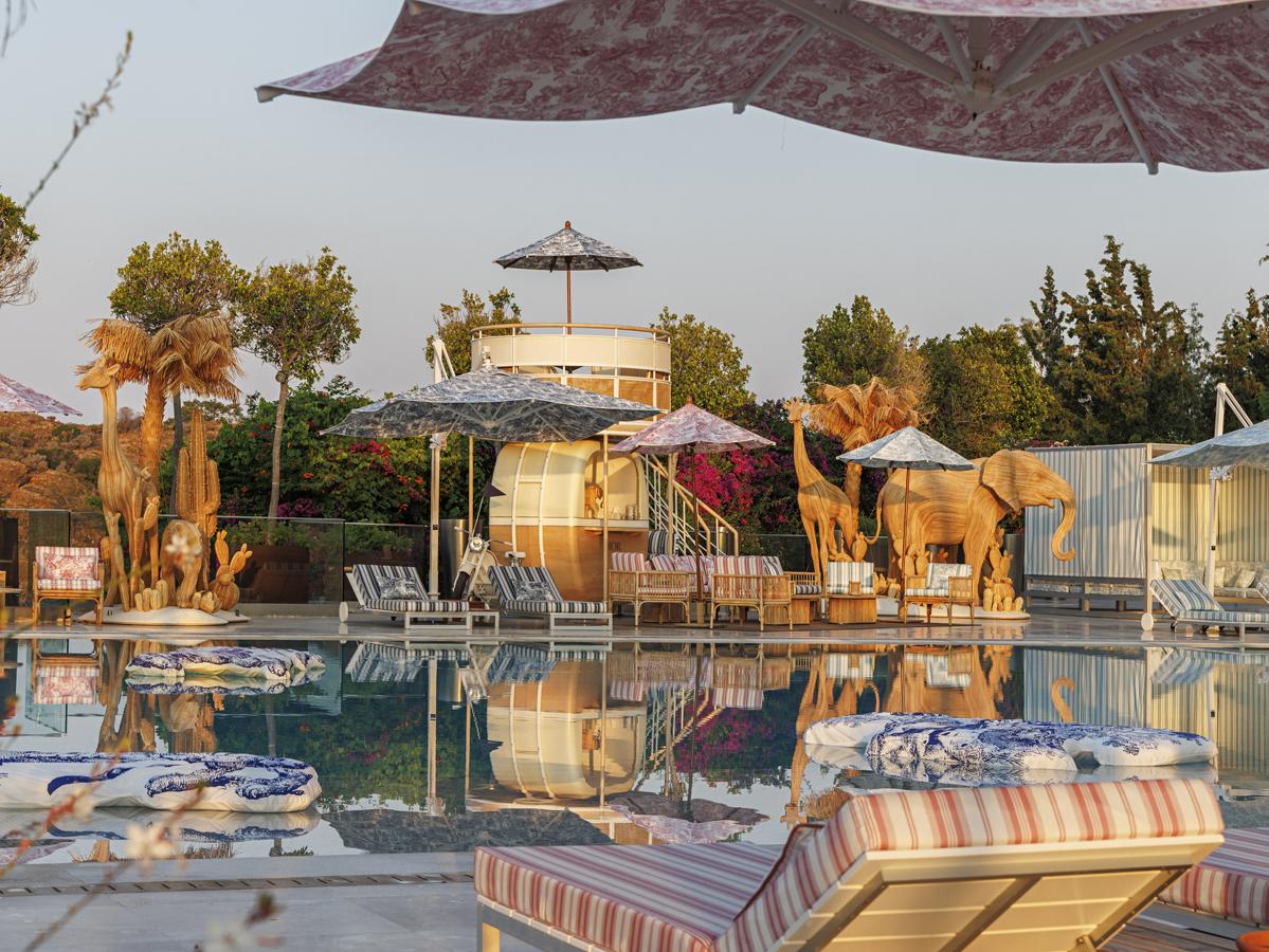 Dior apporte, lui, un vrai geste visuel au séjour. La maison étend son esthétique Riviera dans les espaces piscine et dans la boutique Dioriviera du resort. La boutique est annoncée dans des tons beige, blanc et crème, et cette présence déborde vers les abords du bassin avec des éléments décoratifs conçus pour la saison. Au bord de l’eau, Dior devient ainsi l’un des marqueurs les plus visibles de l’été 2026.