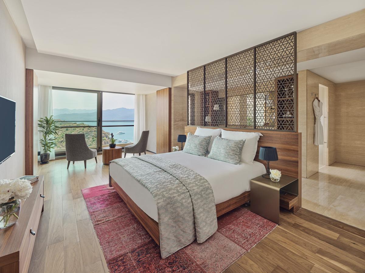 Les chambres sont tournées vers la baie ou vers les montagnes. Elle s’habillent marbre italien et bois de teck poli, pour une ambiance lumineuses. Les suites gagnent en surface et en détail, avec notamment du travertin, cette pierre calcaire claire souvent utilisée dans les intérieurs haut de gamme. La villa pousse encore plus loin cette logique avec 310 m², une piscine privée, des salles de bains en marbre Calacatta. Il ne faut pas oublier une cuisine Gaggenau et un service de majordome 24 heures sur 24.