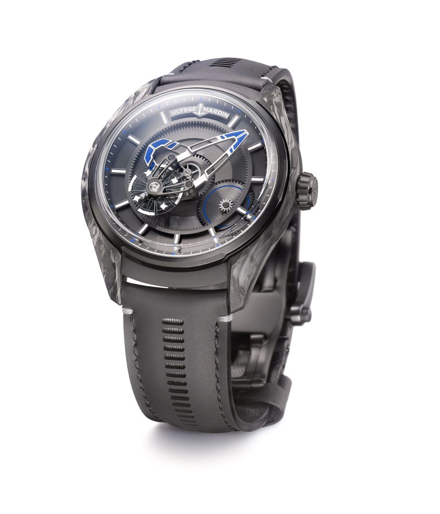 Un balancier ultraléger, visible à l’œil nu, est placé au cœur du design FREAK. Fabriqué en silicium, doté de blocs d’inertie en nickel et de microlames de stabilisation, c’est l’élément caractéristique du nouveau calibre UN-230. Des accents bleu vif lumineux mettent en avant plusieurs détails comme les index, l’engrenage à six heures. Le logo Ulysse Nardin est marqué sur le fond d’un boîtier entièrement repensée.