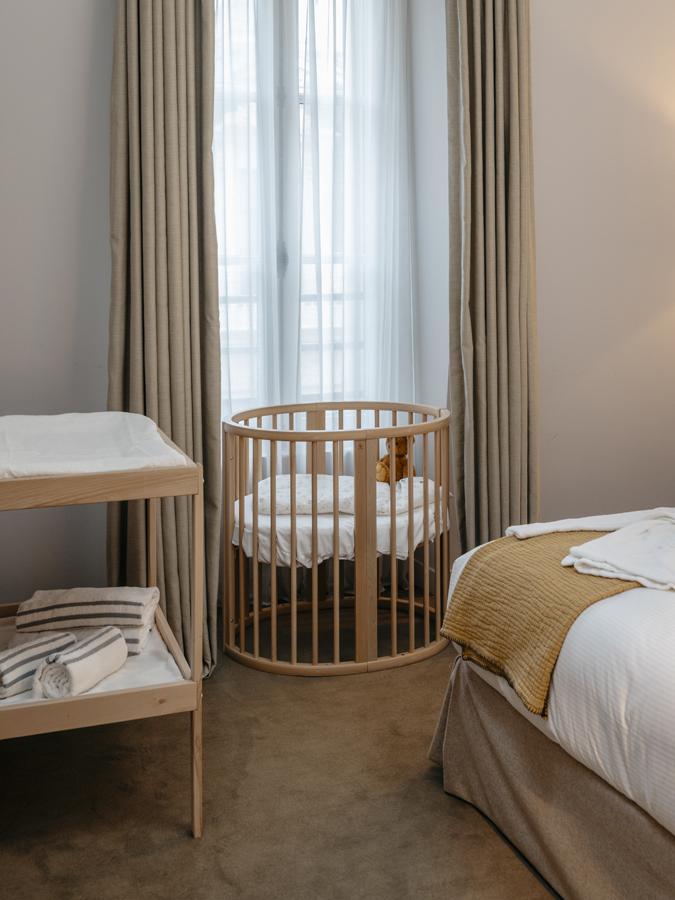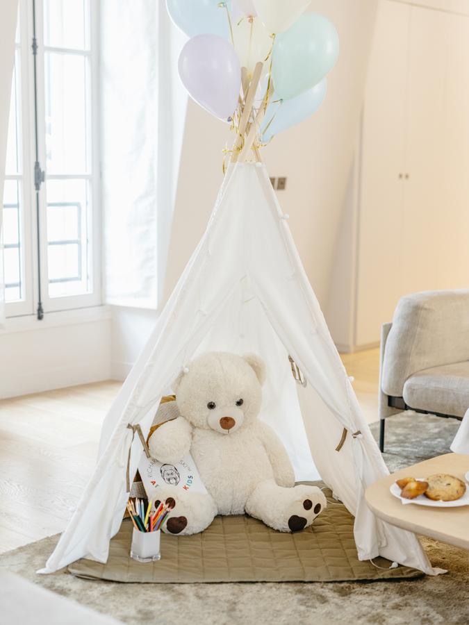 À l’arrivée, les enfants découvrent leurs appartements comme un terrain de jeu. Des tipis sont installés dans les salons, avec coloriages, jeux et petites surprises. Les attentions restent aussi pratiques qu’élégantes : lits bébé, chaises hautes, chauffe-biberons, baignoires et tables à langer sont intégrés discrètement dans l’espace. Les adultes, eux, sont accueillis par du champagne et des chocolats. L’ensemble rappelle davantage une maison préparée pour des invités qu’un simple hébergement de passage.