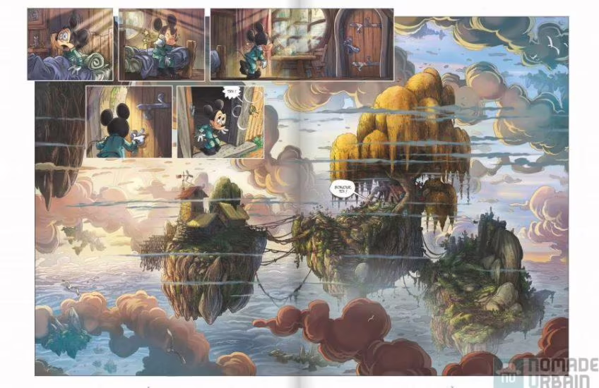Ici je ne parle pas d’un classique mais d’un personnage classique, Mickey. Il est ici revisité en puisant dans des inspirations modernes, plus adulte par bien des aspects. Dans un monde où chacun vit sur de précaires lopins de terre flottants pouvant à tout moment être emportés par de violentes tempêtes. Mickey, maître cordier, a pour mission de tenir en place ces fragiles îles volantes. Sans cesse sollicité, son travail lui évite de trop penser à la perte récente de son ami Dingo. Jamais Mickey n’a été aussi seul et démuni. Il doit pourtant affronter le tyrannique seigneur Fantôme, voleur des terres des plus pauvres.