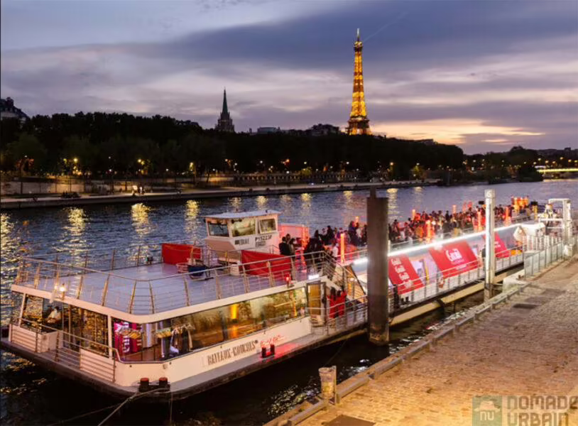 Je monte donc sur la terrasse de la péniche, où s’affichent un grand bar et un plus petit au fond. La décoration est de rouge et de blanc, plusieurs petites tables et quelques blocs de métal qui peuvent servir de siège. De toute façon, nous ne sommes pas là pour rester assis et regarder le paysage, il y’a les bateaux-mouches pleins de touristes pour ça.