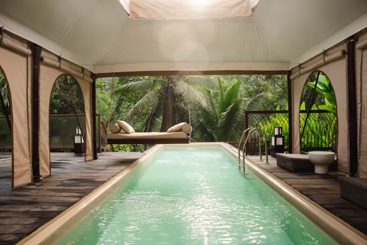 Mais pour les romantiques, une autre option s’impose : Kanva, l’espace glamping du domaine. Au cœur de la vallée, 11 tentes de 89 à 140 m² y sont dispersées dans la forêt tropicale. Des jacuzzis privés, des piscines à débordement et des vues à couper le souffle. Le tout avec service de majordome et ambiance de déconnexion absolue.