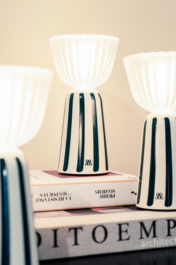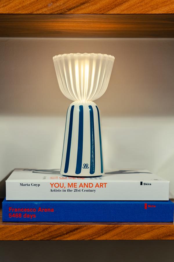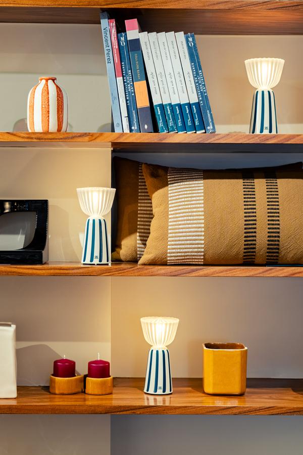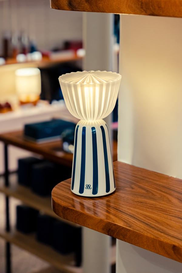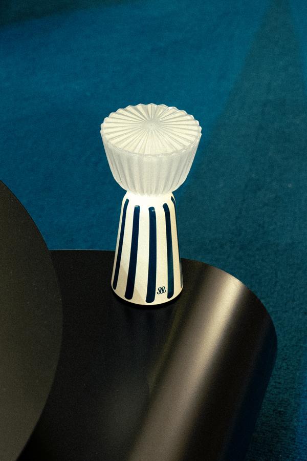 Une table de terrasse s’illumine d’un bleu rayé quand la nuit tombe doucement. Captant la lumière comme un soleil couchant, la lampe Swiing Sarah Lavoine x Fermob (sans fil et rechargeable), en édition limitée veut marquer la saison printemps-été 2026. Son geste basculant révèle un éclat feutré qui enveloppe terrasses et dîners estivaux d’une douceur addictive.
