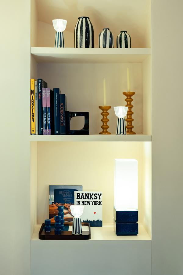 Ce Bleu Sarah, profond et lumineux, traverse la base cuivrée pour un effet rayé affirmatif. Il capte les reflets du soir et les rend plus chaleureux sur les surfaces environnantes.