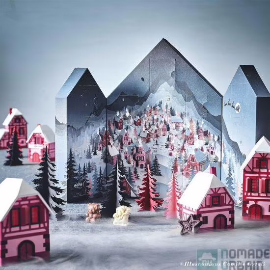 L’inspiration graphique de cette sublime collection a été confiée à l’artiste « Designer Papier » Camille Ortoli. Elle a a imaginé les lignes d’un village alsacien, à flanc de montagne sous la neige et entouré d’une forêt féerique. Cela est presque dommage de déguster les chocolats, mais vous pouvez fermer le calendrier et ainsi en garde la beauté.