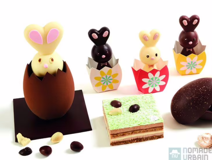 Proposez un paysage bucolique à vos lapins avec ce Carré de Pâques ! Pierre Marcolini a créé un entremets qui trouvera toute sa place sur une table de Pâques. Ses délicieuses couches laissent apparaître un sabayon chocolat au lait, une crème brûlée à la vanille, un croustillant aux noisettes caramélisées que vient recouvrir un voile de chocolat. Les Petits lapins y ont laissé derrière eux de petits œufs pralinés…