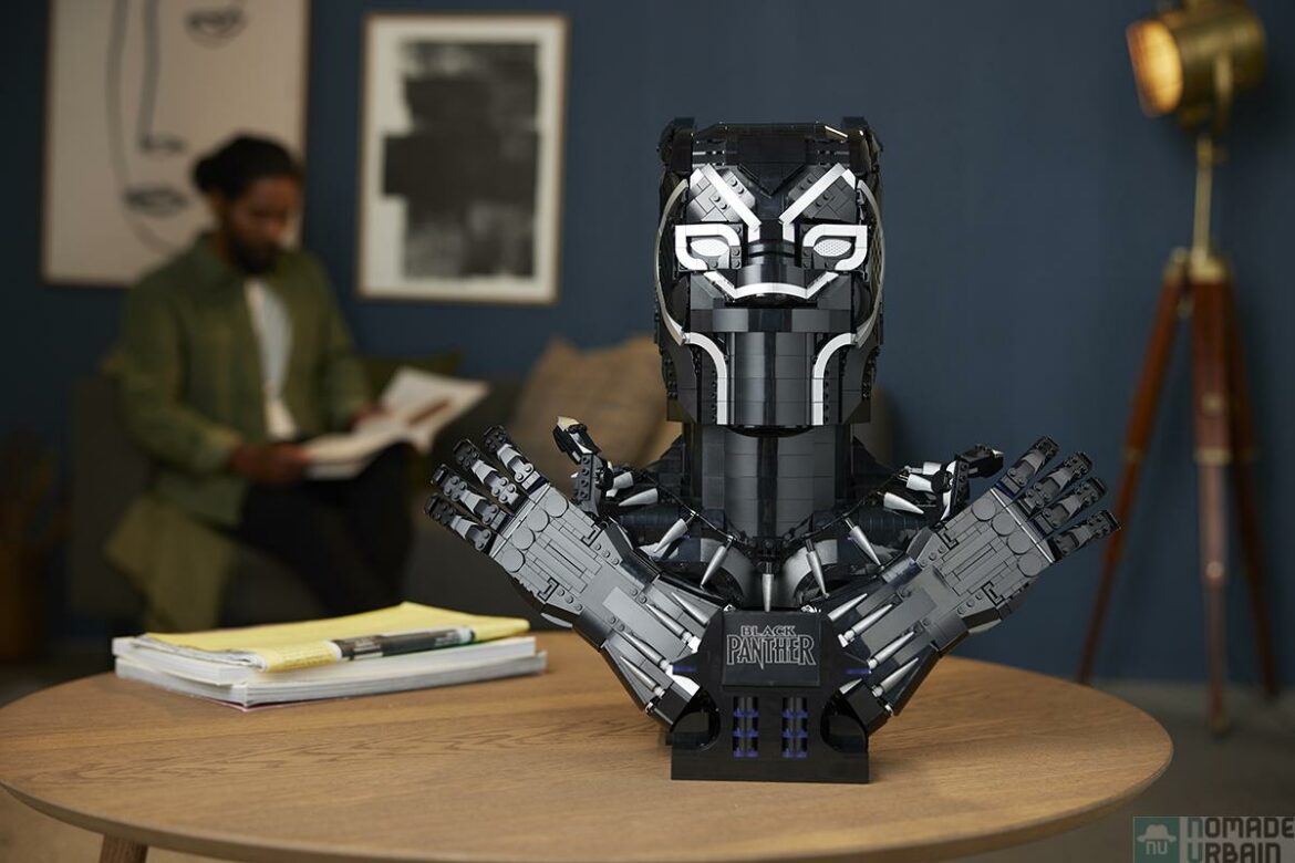Le set LEGO Marvel représente un buste grandeur nature du super-héros. Il affiche, ou non, la pose caractéristique du salut de « Wakanda Forever ».
