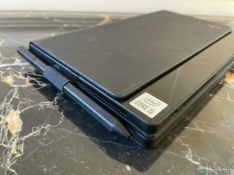 Une jolie couverture en cuir véritable, une petite surface noire laquée, ce Lenovo fermé a tout d’un beau livre. Surtout si vous avez le stylet accolé sur le côté. Il est très compact (23,6 x 15,82 x 2,78 cm pour 960 g) et facile à glisser, même dans un sac à main ou un baise-en-ville.