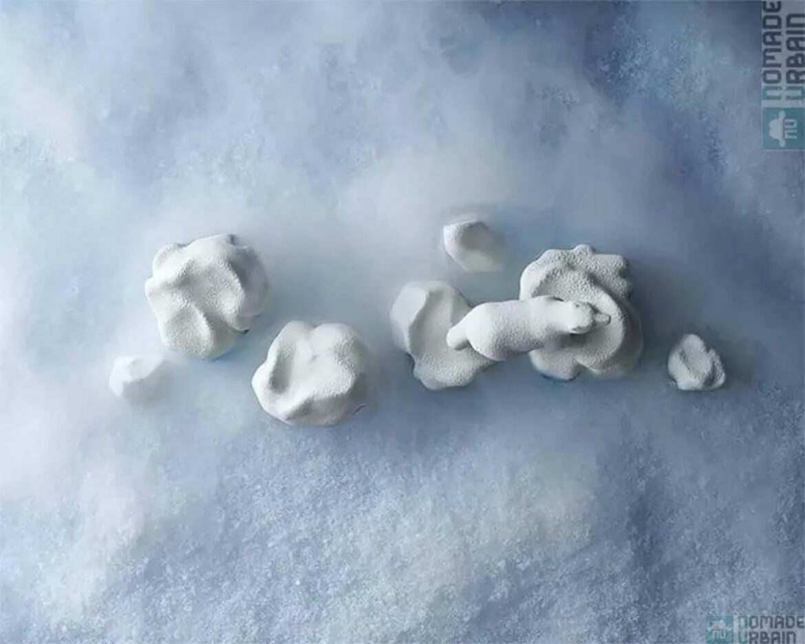 C’est là où Noël est le plus blanc, le plus scintillant, le plus grandiose, que le Bristol nous emporte. Magistrale sculpture sucrée, cette bûche est un chef-d’œuvre de pureté et de douceur, aussi belle que spectaculaire. Ours blanc et icebergs en mousse de marron aérien, à la douceur subtilement magnifiée par un cœur de gelée de kalamansi. Le tout se pose sur une dacquoise aux noisettes et aux marrons.
