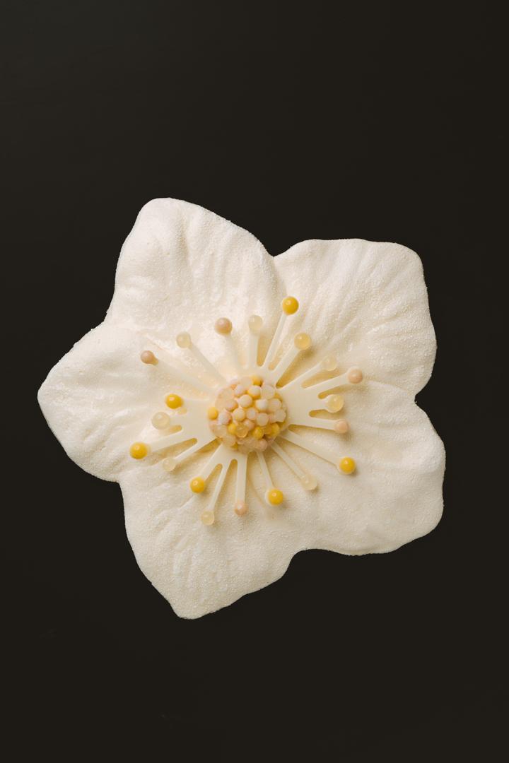 La dégustation se déroule comme une chorégraphie en quatre temps sous une coque en chocolat blanc. Une mousse légère à la mandarine et à la vanille donne le ton de cette partition aérienne. Elle s’accompagne d’une génoise délicate parfumée à l’eau de rose. Le chef ajoute du caractère à l’ensemble avec un croustillant praliné-pistache. Le final se joue sur un insert à la mandarine confite marié à un crémeux au chocolat au lait.