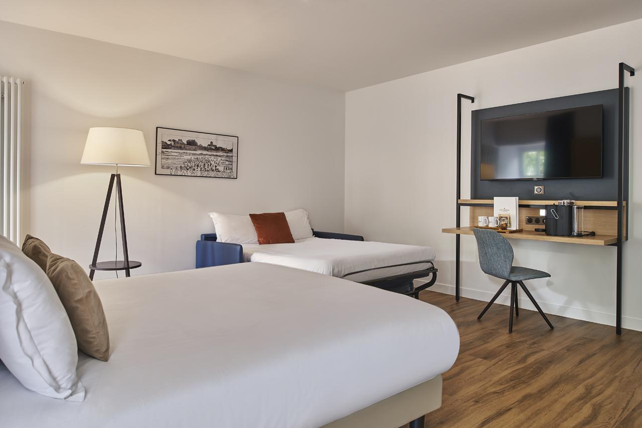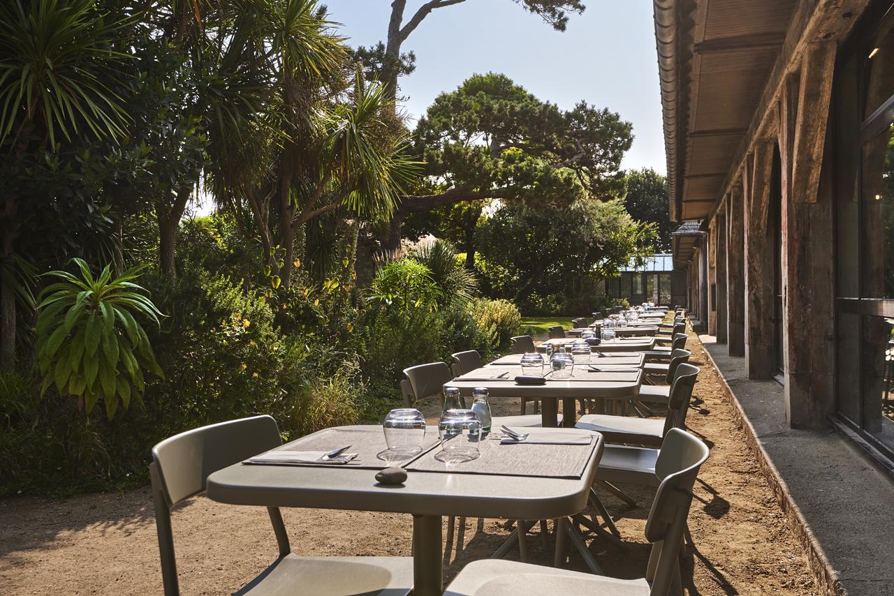 La Maison des Équipages se tourne davantage vers les familles. Ses 14 chambres empruntent leur vocabulaire aux voiliers, avec le bois comme matière dominante, parfois prolongé par le métal. Huit chambres ouvrent en plus sur une terrasse privative de 6 m² .