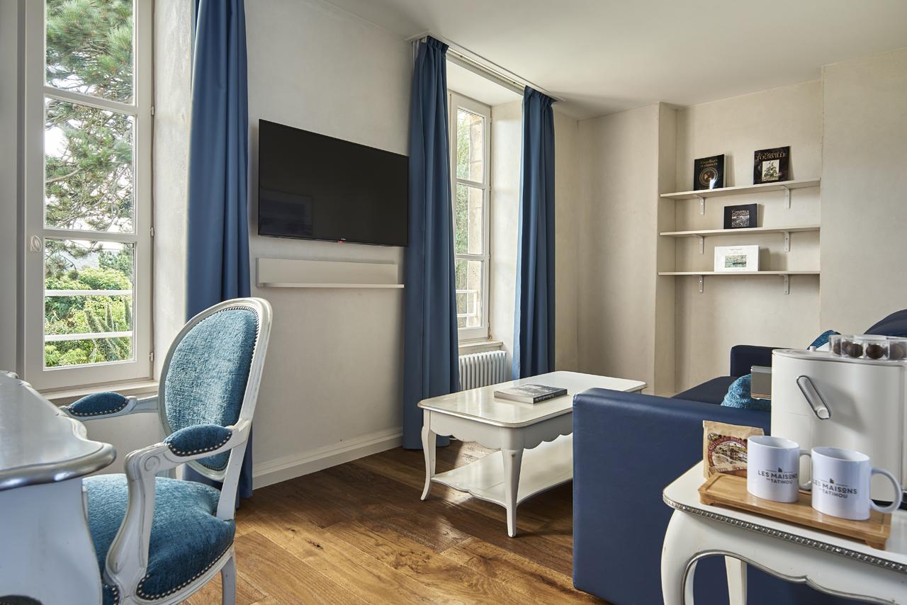 La Maison des Gabiers accueille 8 chambres doubles. C’est la partie la plus immédiatement identifiable, avec une décoration colorée inspirée des cabanes de plage de Gouville-sur-Mer. Le résultat donne quelque chose de plus léger, plus vif, presque balnéaire, sans quitter le cadre historique de l’île