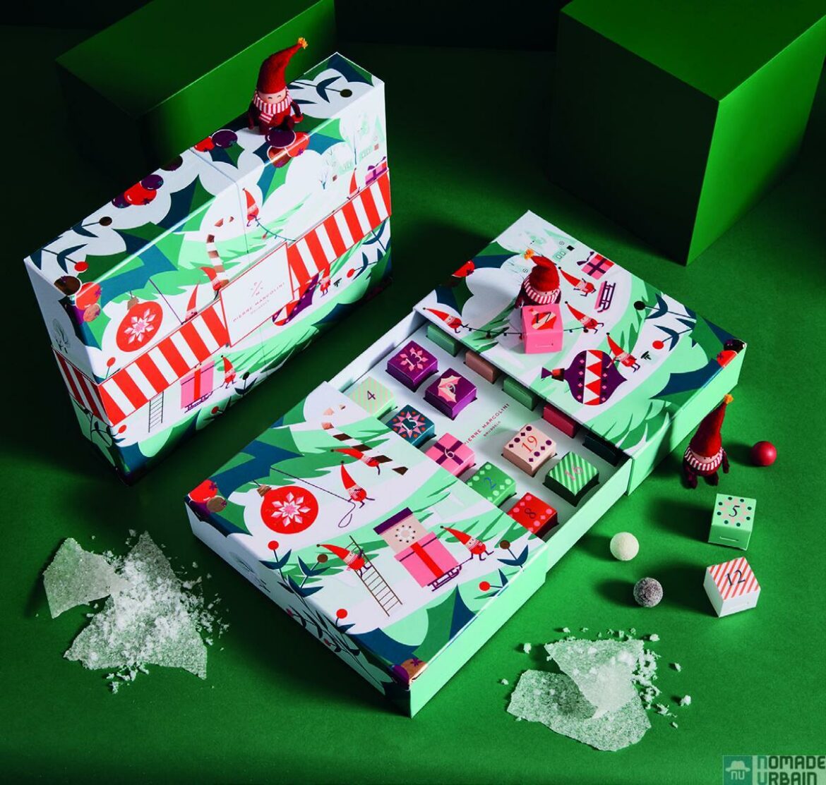 Pour patienter en attendant Noël, CHOCOLAT FOUCHER propose un calendrier coloré et pimpant en collaboration avec l’illustrateur Aloïs Marignane. Fermé par un nœud rouge élégant, il s’ouvre comme un livre pour découvrir le dessin original. Il est garni de ses meilleures créations (ganaches, pralinés, nougatines).