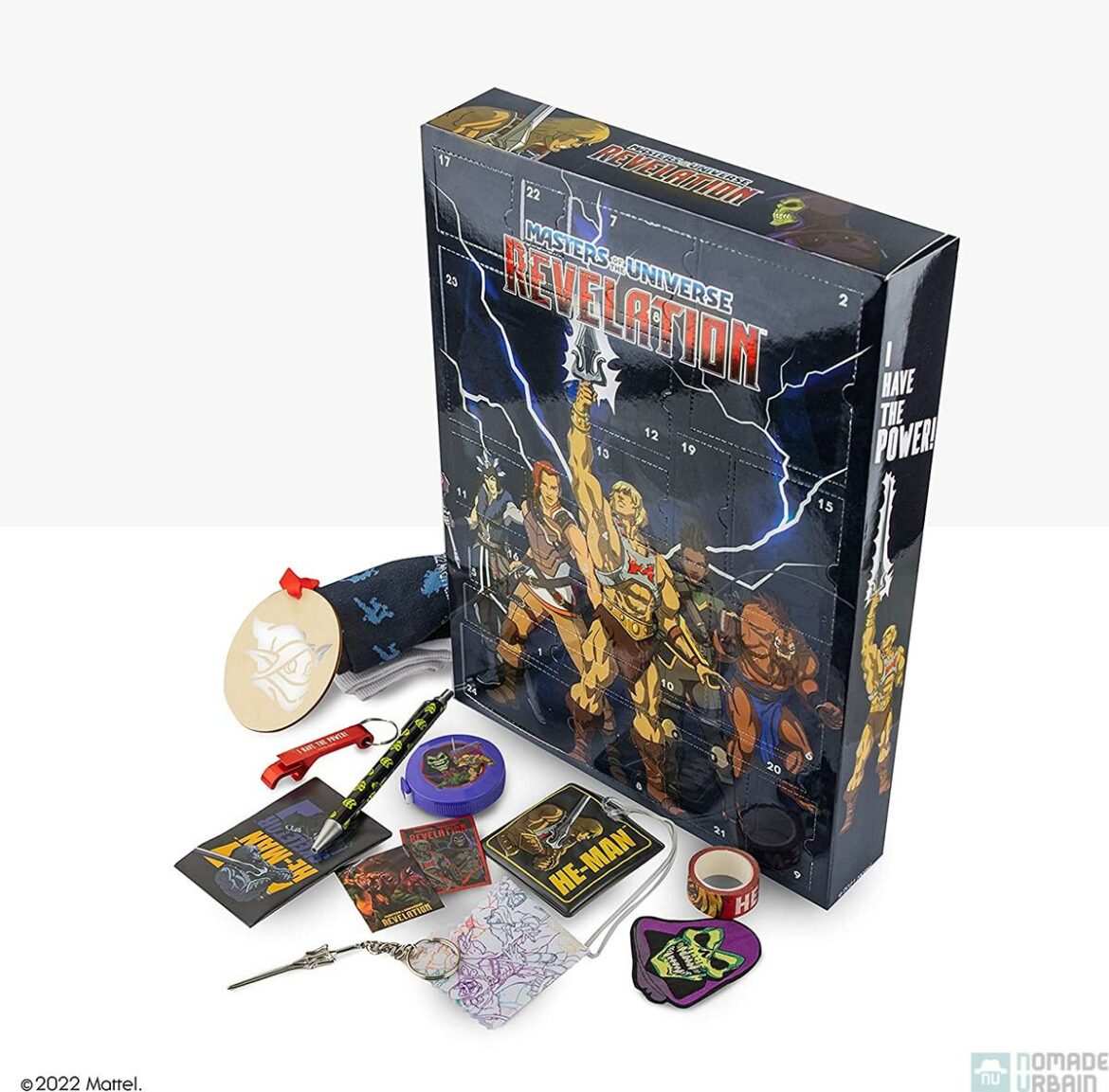 Cinereplicas et Mattel proposent aux afficionados de Musclor et Squeletor un calendrier de l’avent fait pour donner le sourire. Ainsi, sur 24 jours, vous aurez 24 petits cadeaux qui vont du stylo, à la paire de chaussette, en passant par un porte-clés, ou encore un décapsuleur, tous à la gloire de He Man. Les vilains ne sont pas oubliés comme vous le constaterez en le découvrant.