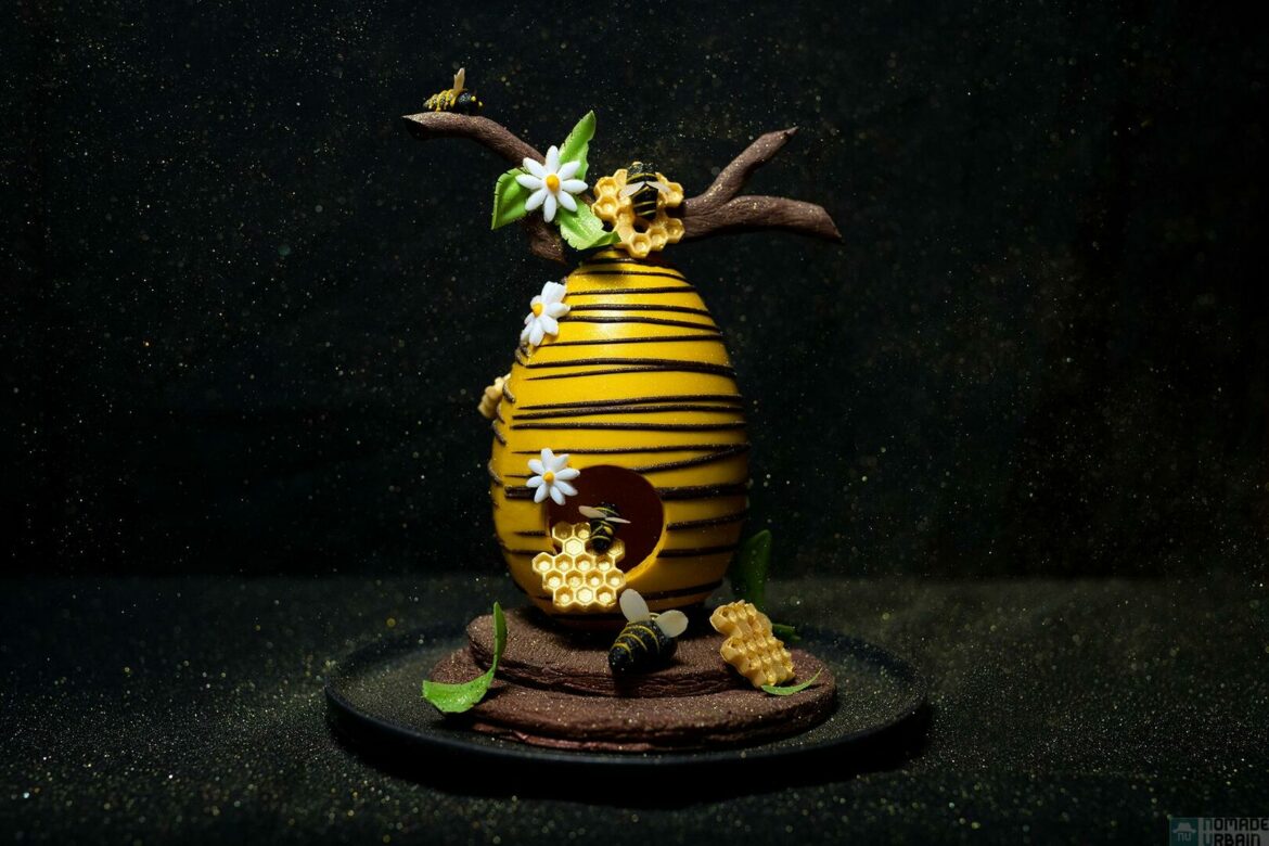Le Chef pâtissier du Waldorf Astoria Versailles-Trianon Palace offre cette année une création chocolatée créative et positive. Le Chef Eddie Benghanem s’inspire de l’atmosphère espiègle et champêtre de Pâques, de la flore des jardins royaux et de la très symbolique abeille. Composé de chocolat au lait, le socle vert fait écho à la nature et la fraîcheur printanière. La star de la création : la reine des abeilles ! Coiffée d’une couronne, elle est la référence ultime à Versailles et à la royauté. Ces deux derniers éléments sont intégralement créés en chocolat blanc. Pour compléter cette création chocolatée d’une note créative, les traditionnels œufs en chocolat sont remplacés par un gourmand gâteau de voyage chocolat praliné.