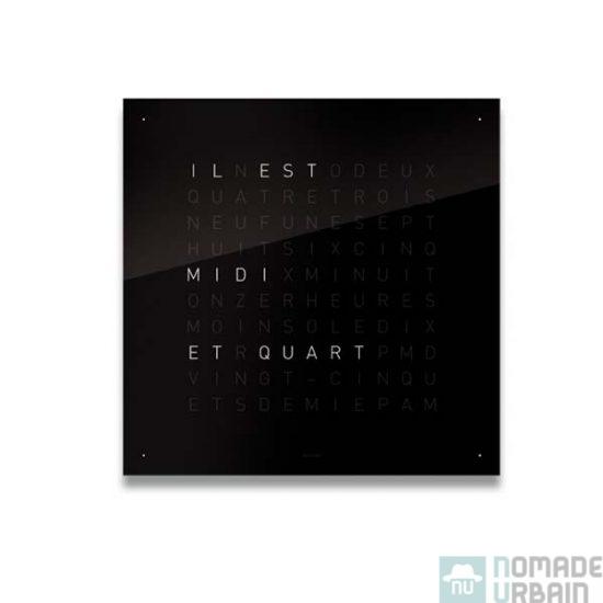La QlockTwo Classique est une horloge murale de 45 x 45 cm. Le design est très simple, épurée un simple carré comme l’ensemble des produits de la marque. Il existe en 8 couleurs (noir, blanc, métal brossé, bleu ciel, vert pomme, rouge, mauve et chocolat) et supporte 12 langues, dont le français. Elle existe aussi en version Large avec des dimensions de 90 x 90 cm/