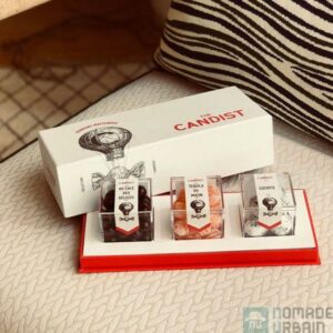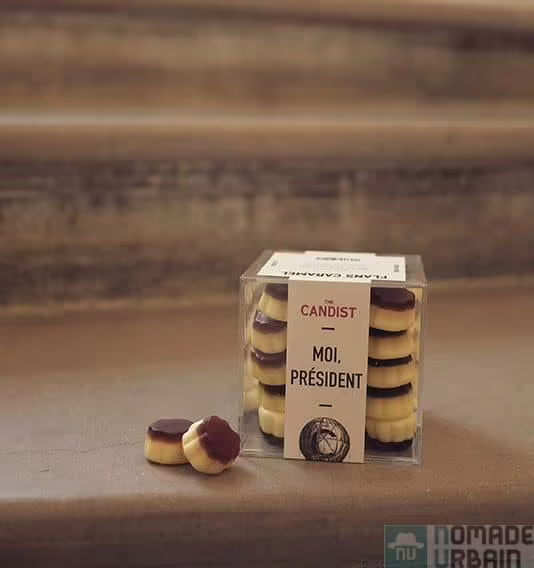 Enfin, comment résister aux étiquettes old-school et les noms des bonbons comme Juste Un doigt pour les amateurs des Nuls et de Whisky, Moi président en design et goût de Flamby ou le Metro Boulot Mojito et bien d’autres… The Candiste propose des coffrets et se trouve dans des Corners de grands magasins.