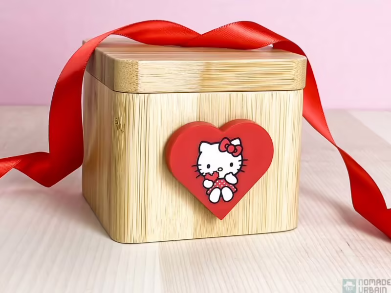 Vous pouvez même personnaliser votre box en changeant par exemple le petit cœur en façade (14,99 euros). Il est même possible de faire graver (14,90 euros) un petit message sur le bois. Et enfin, si la personne aimée est un peu Kawaï, alors la version Hello Kitty est incontournable.
