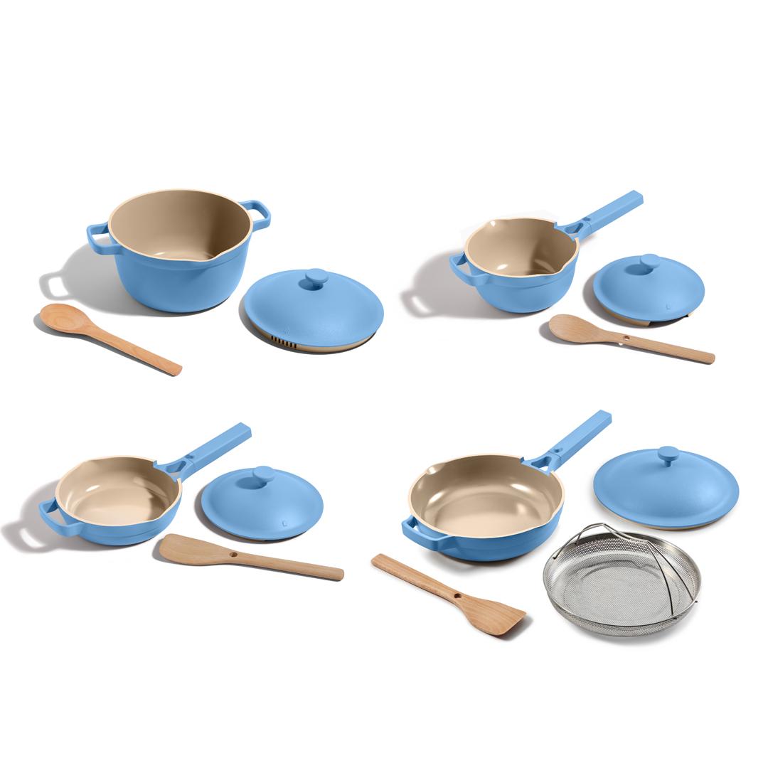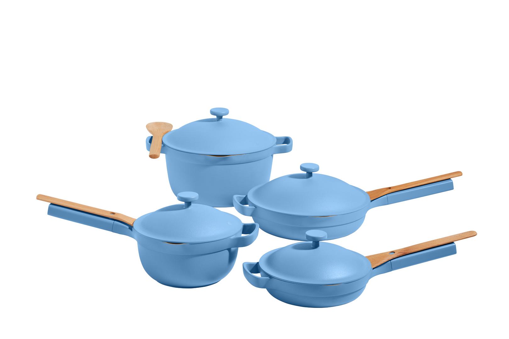 Our Place Bleu Pétale habille l’ensemble de la gamme céramique antiadhésive de la marque. On retrouve notamment l’Always Pan 10-en-1 (140 €), le Duo Céramique Mini (205 €), le Duo Céramique (235 €) et le Set Céramique (350 €).