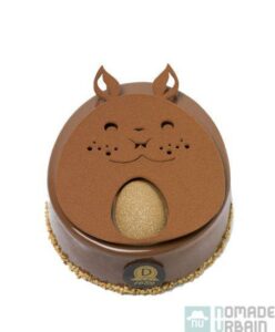 Je termine par le délicieux Dalloyau Pakoro (entremet individuel 7.90 euros, pour 6/7 personnes 49 euros) , un dessert mi-chat/mi-œuf. Sous la carapace ajourée au chocolat au lait se cache un croustillant aux amandes, surmonté d’une dacquoise craquante aux amandes brutes et aux éclats de dragées. En son cœur, un crémeux caramel parfumé aux amandes de Sicile se marie à la douceur d’une mousse chocolat au lait 46 % cacao République dominicaine.